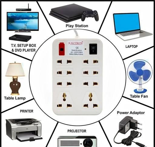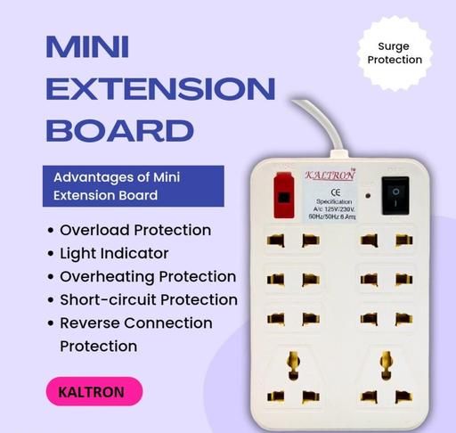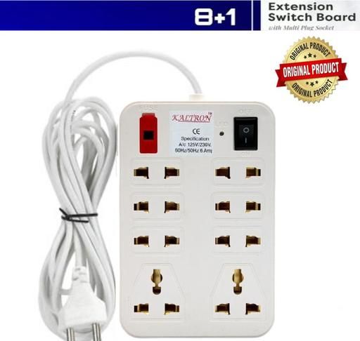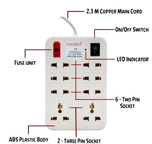 White colored extension cord with 8 electric sockets and 1 fuse One universal switch to control all 8 sockets Fuse rating 6 amp ; Safety on/off switch Features an LED light as an indicator of the on/off switch, and 2 meters cord Precaution :- User do not use strip for heavy load equipment's like microwave oven, press, geyser, immersion rod etc. Can be use below 1000 watt devices as total load on the strip. SLEEK & COMPACT DESIGN - The simple and convenient design adds to the smart construction. The sleek and compact design helps you store this board anywhere when not in use! Use it for powering computers, TV's, laptops, mobiles and various other electrical appliances below 1000 watt as it easily has a long service life . SHOCK PROOF ABS MATERIAL - ABS housing material for high impact and good chemical resistance. You are rest assured that the Kaltron extension board is reliable and a durable option for all your power needs 2 METER POWER CABLE - If you are worried about how you can use the spike guard away from the source of electricity, then you need not worry much as the Kaltron extension cord having 2 meter long cord to allow you better usage.