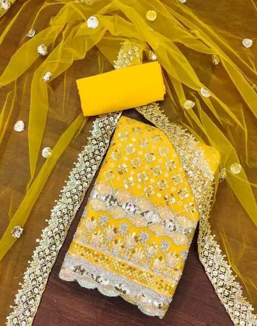 Elegance Unveiled: The Unstitched Net Suit with Exquisite 3 and 5 mm Sequin Work Women's PAKISTANI SUIT FOR WOMENS TOP DUPPATA EMBROIDED Unstiched Double Sequence Embroidered Work Plus Double Salwar Suit & Dress Materials GOLD Colours