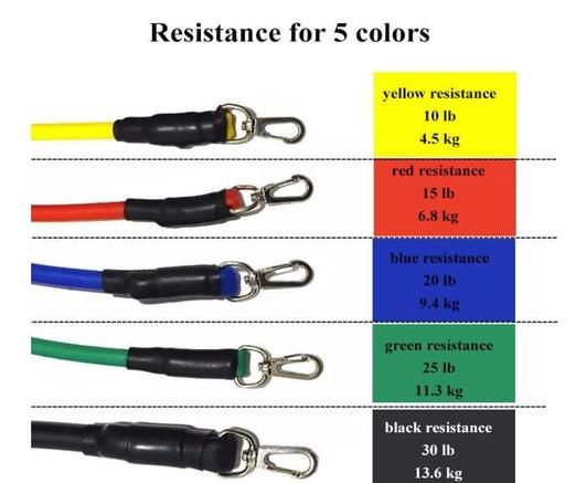 5 Colors Levels of Resistance- Resistance Bands Set includes – Black (50 lbs.), Green(40 lbs.), Blue (30 lbs.), Red (20 lbs.), and Yellow (10 lbs.). The bands can be used alone or stacked in any combination to achieve your optimal resistance level up to 150 lbs.