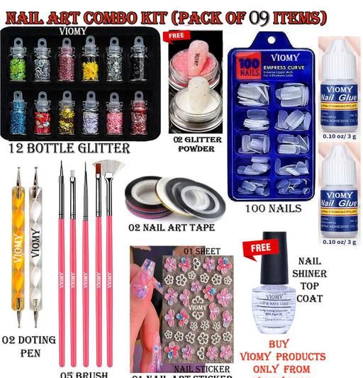 Product Name: NAIL ART KIT WITH 12 PCS GLASS BOTTLES GLITTER STONES + Nail Art Dust 2 Pcs + 2 NAIL TAPES + 05 NAIL ART BRUSH + 02 NAIL DOTTING PEN + 2 NAIL GLUE + 100 NAILS + 01 PCS NAIL SHINER TOP COAT+ Sticker