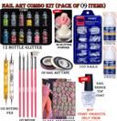 NAIL ART KIT WITH 12 PCS GLASS BOTTLES GLITTER STONES + Nail Art Dust 2 Pcs + 2 NAIL TAPES + 05 NAIL ART BRUSH + 02 NAIL DOTTING PEN + 2 NAIL GLUE + 100 NAILS + 01 PCS NAIL SHINER TOP COAT+ Sticker
