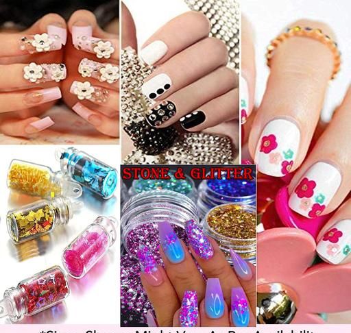 Name: NAIL ART KIT WITH 12 PCS GLASS BOTTLES GLITTER STONES + Nail Art Dust 2 Pcs + 2 NAIL TAPES + 05 NAIL ART BRUSH + 02 NAIL DOTTING PEN + 2 NAIL GLUE + 100 NAILS + 01 PCS NAIL SHINER TOP COAT+ Sticker