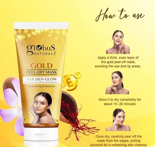 Globus Naturals golden glow peel off mask is enriched with goodness of gold bhasma saffron, turmeric Vitamin-E for brighter, smoother and more radiant skin. The gold mask will leave your skin cleaner, brighter, smoother and more radiant than ever before, helping to remove blackheads and excess oil from your skin. It provides the skin with an additional level of hydration, firmness and prevents the early signs of acne and pimples. It is suitable for all skin type.