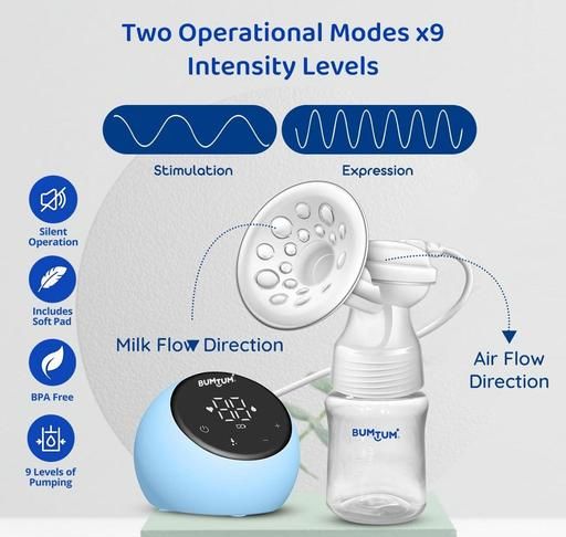 Experience seamless lactation with our Single Breast Pump featuring dual-phase operation. This powerful device combines suction and nipple stimulation for quick and uninterrupted milk flow. Designed to fit any breast size and shape, it includes a soft silicone cushion for added comfort. The anti-backflow design ensures milk stays pure by preventing contamination from reflux. Our breast pump boasts a one-touch digital display and smart memory that recalls your last settings, making it incredibly user-friendly. The USB charging port offers ultimate convenience, allowing you to charge it with AC adapters, power banks, laptops, or even car chargers. With 2 pumping stages—stimulation and expression—and 9 intensity levels for each, it mimics a natural breastfeeding experience How to Use: Assemble and sterilize all parts. Attach the soft silicone cushion to the breast shield and place it over your breast, ensuring a secure seal. Press the power button, select the mode and intensity on the touch display, and the pump will start. It begins with the stimulation phase and automatically switches to the expression phase. After use, turn off the device and clean all parts.Note: it operates on direct power with no need for batteries and comes with a one-year warranty for adde