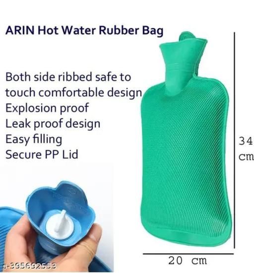 Name: Hot Water Rubber bag for Pain Relief Therapy Multicolor Heating Pad-Heat Pouch Hot Water Bottle Bag (PACK OF 1) Capacity: 1000-1500ml License/Registration Expiry Date: 20 License/Registration Number: 20 License/Registration Type: Form 20 Net Quantity (N): 1 Operating Temperature: 100° C Power Consumption: 0 - 249 W Count (Pack of 1) Material Rubber Colour Multicolour Product Benefits Back Pain Relief Material : Rubber, unlike other unreliable water bags, its can resist the hot water pressure comfortably. Usage Instructions : Add hot water , close the cap. Used for heat therapy treatment Fill 2/3rd of the bottle and before tightening the stopper expel the excessive air.. Treats muscular pain, induces relaxation, releases stress nstantly relieves joint pains, muscular cramps, menstrual pains, stomach and back aches. Rubber bag : - High quality guaranteed rubber hot bag, Leak proof, colorful, high quality, Easy to clean and Keep water hot for longer time Country of Origin : India Country of Origin: India