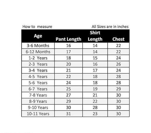 5-6 Years (Top Chest Size: 28 in, Top Length Size: 19 in, Bottom Waist Size: 29 in, Bottom Length Size: 25 in)