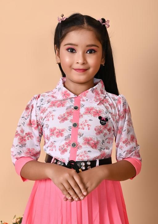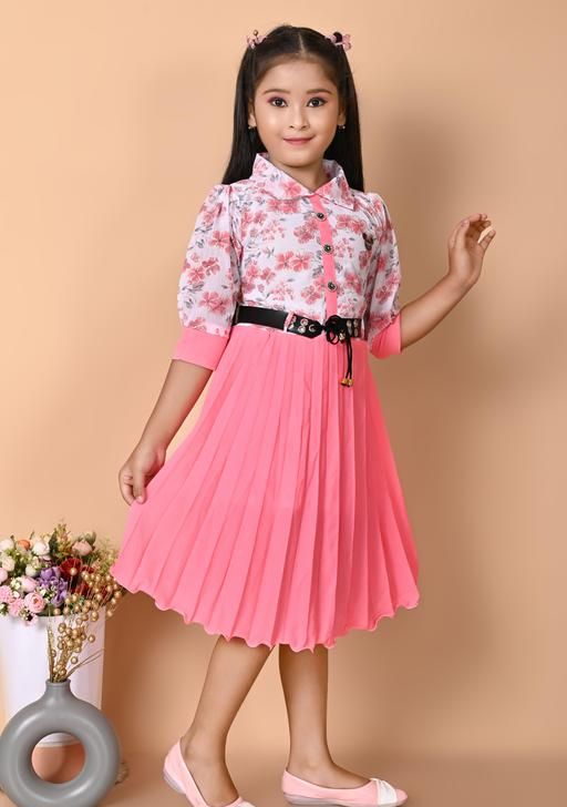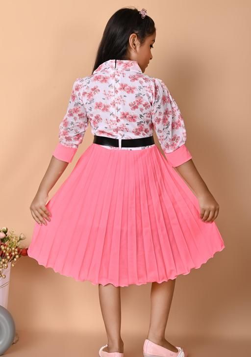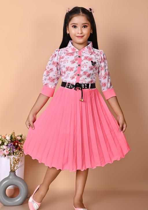 Name: Party wear frock for kids girl | A-Line Silhouette, Two-Piece Design Top and Pleated Skirt, Above Knee, Short Sleeve, Polo/Collar, A-Line, Curved, Buttons, Bows, Belted, Partywear, Pleated Dress, for Girls Pink, White | pink and white floral, Mickey Mouse, A-line silhouette, two-piece design (top and pleated skirt), bows, A-line, dress, pleated dress, pleated skirt, button placket, belt, buttons, short sleeve, polo/collar, belted, curved, above knee, unlined, Girls, partywear, polyester blend,