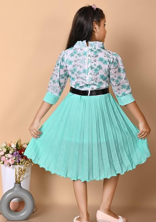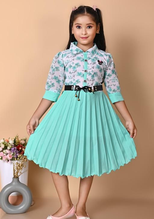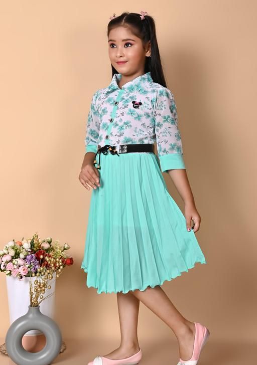 Party wear frock for kids girl | mint green and white floral, Disney character (Mickey Mouse), A-line silhouette, pleated skirt, belted waist, buttons, bows, A-line, one-piece, pleated dress, pleated skirt, belt, buttons, short sleeve, polo/collar, belted, scalloped, above knee, Girls, partywear, summer, belt