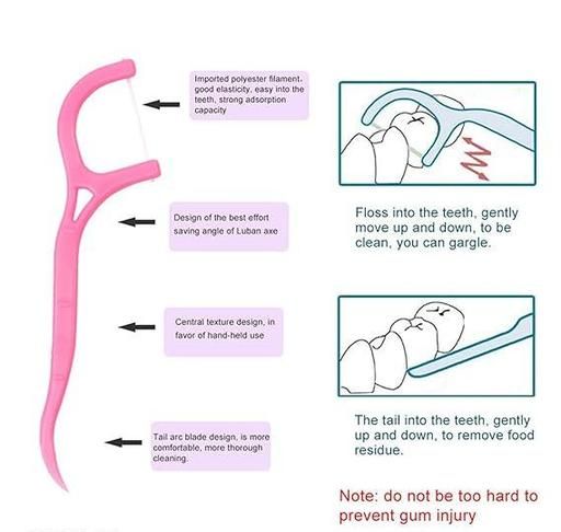 How to use- Gently slide the dental floss between the teeth in a zigzag motion. Be careful not to let the floss snap or pop between teeth.