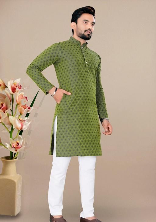 A cotton kurta pajama set for men refers to a coordinated outfit consisting of a kurta (shirt or tunic) and pajama bottoms made entirely from cotton fabric. This traditional Indian ensemble offers comfort, breathability, and a classic look for various occasions.