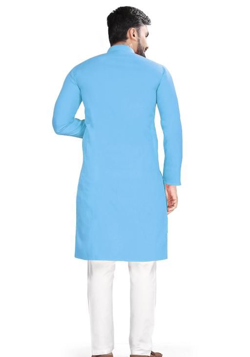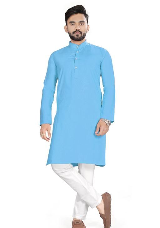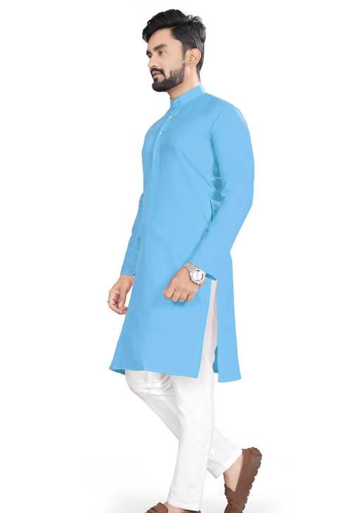 Men's ethnic kurta featuring a Chinese Collar , full sleeves, 2 side pockets and a regular fit. It is crafted from fine cotton. Bottom type is churidar with Nada and zip and 1 hidden pocket