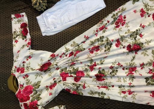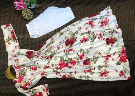 Delta cotton fabric frock with white cotton leggings.