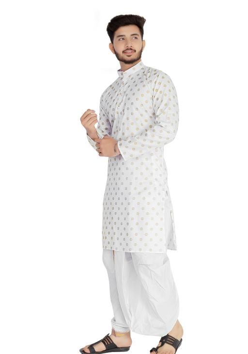 Name: Men Boys Traditional Fancy Cotton Kurta with Stitched Readymade Silk Dhoti - white kurta and white dhoti