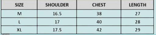 M (Chest Size: 38 in, Length Size: 27 in, Shoulder Size: 16.5 in)