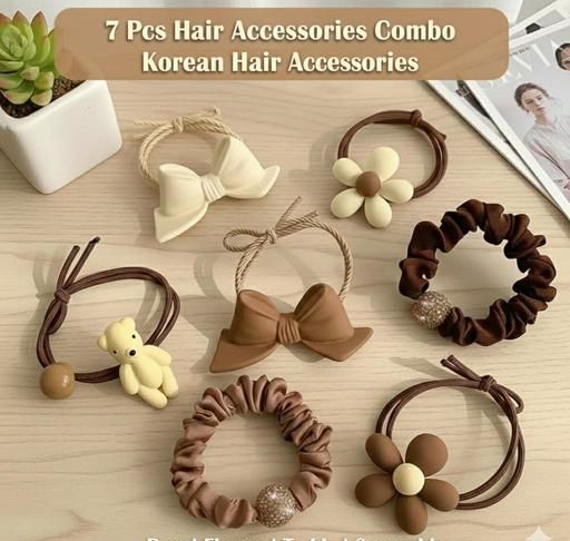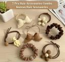 Name: Pack Of 7 Pcs Stylish Coffee Hair Accessories Set Fashion Brown Bowknot Flower style Hair band Elastic hair Bands Cute Ponytail Rope for girls women Korean Cute Flower Bow Scrunchies Set Women