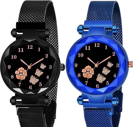 Pack Of 2 Black Flower Printed Dial Luxury Magnetic Strap Girls Analog Watch - For Women