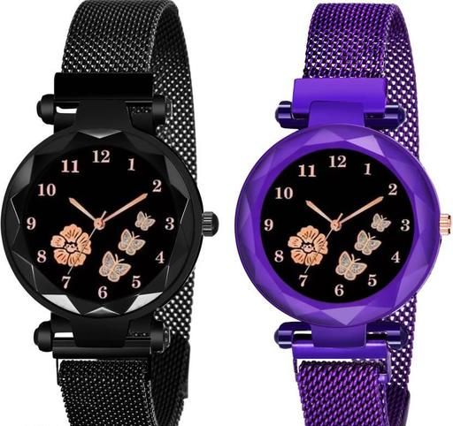 Pack Of 2 Black Flower Printed Dial Luxury Magnetic Strap Girls Analog Watch - For Women