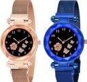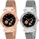 Pack Of 2 Black Flower Printed Dial Luxury Magnetic Strap Girls Analog Watch - For Women