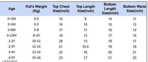 3-4 Years (Top Chest Size: 24 in, Top Length Size: 16 in, Bottom Waist Size: 20 in, Bottom Length Size: 13.5 in)