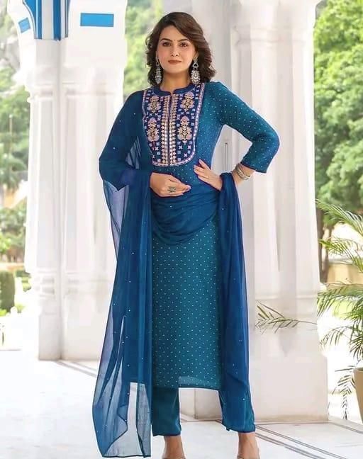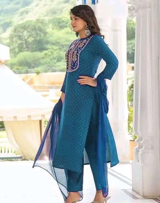 Women's Peach Ethnic Motifs Embroidered Kurta with Trouser & Dupatta Name: Women's Peach Ethnic Motifs Embroidered Kurta with Trouser & Dupatta Kurta Fabric: Rayon Slub Fabric: Rayon Slub Bottom wear Fabric: Cotton Blend Sleeve Length: Three-Quarter Sleeves Pattern: Solid