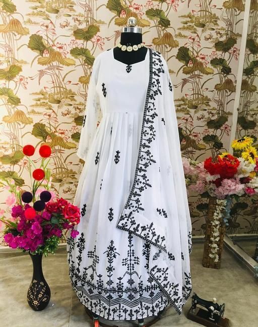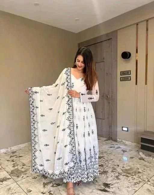 Miss clothing women's gown with dupatta set printed soft fabric with floral embroidery work V-neck styel with long sleeves for lowest price party and ethnic casual wear dress maxi,anarkali,solid,formal,solid,bollywood styel long gwon,white-black colour mirror work kurtas with dupatta set at india's best online shopping store wedding wear styelish all pourpose funcational trending dress