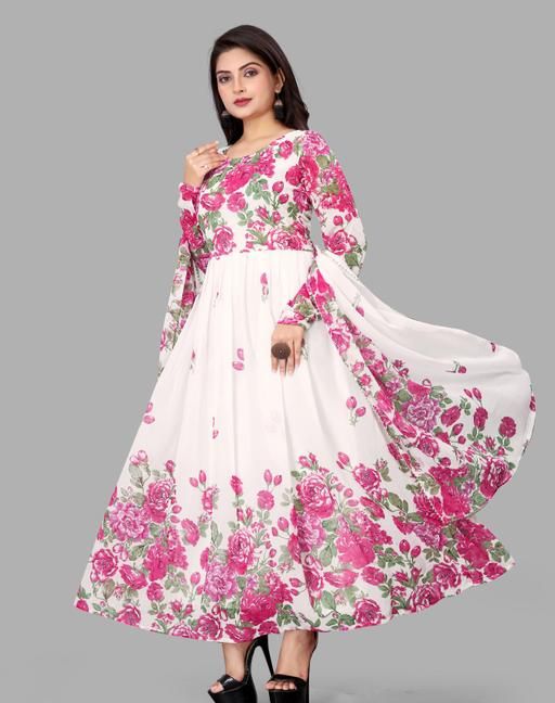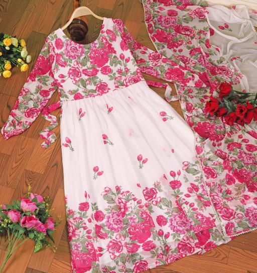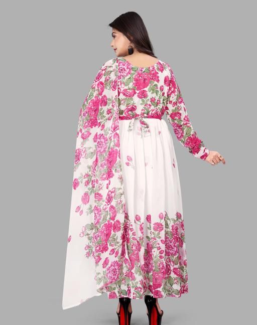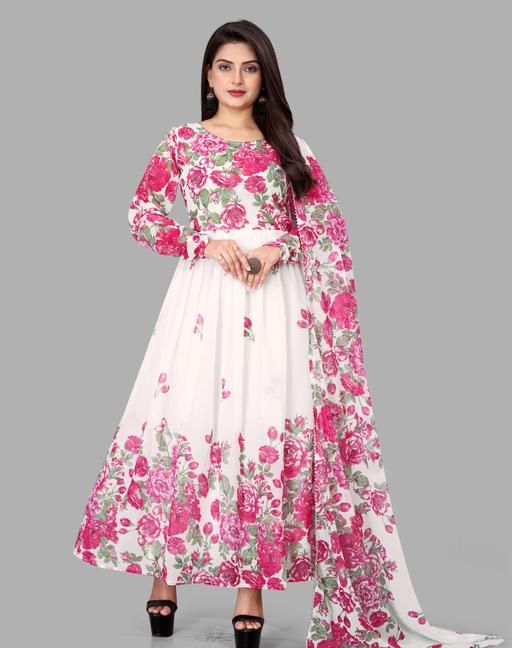 Name: White Floral colour Georgette Fabric Digitally printed Gown and Duppata Set for woman (NO BOTTOM)