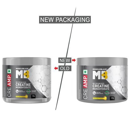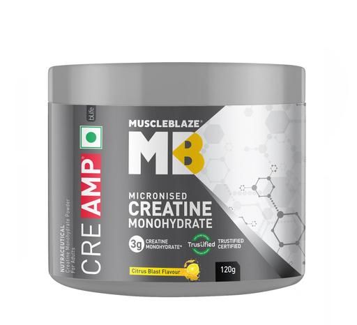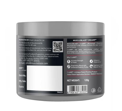 MuscleBlaze Creatine Monohydrate CreAMP™ is not your regular creatine monohydrate, CreAMP™ is developed in-house using a patent-pending blend MB CreAbsorb™ which reduces deterioration of Creatine Monohydrate into Creatinine (ineffective form of creatine) which ensures higher bioavailability of Creatine Monohydrate resulting in better athletic performance. Every serving of MB Creatine Monohydrate provides 4 g of creatine which is instantly absorbed by the body, providing a constant supply of energy by resynthesizing ADPs into ATPs (the energy currency) of your body. Regular consumption of MuscleBlaze Creatine Monohydrate CreAMP™ allows you to sustain longer in the gym and attain lean muscle mass. MuscleBlaze Creatine Monohydrate CreAMP™ is a great source for enhanced levels of stamina, strength, endurance, metabolism, and energy. It helps the muscle cells to inflate, producing a fuller appearance with its stimulus for bolstered protein synthesis in the body. It also helps stimulate cognitive functions to result in a more focused athletic performance.