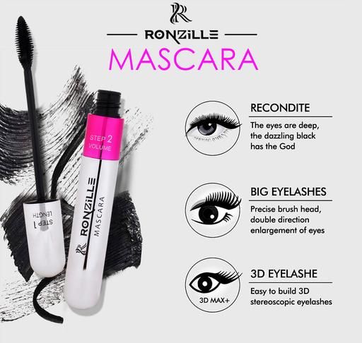 Ronzille Mascara to give you volumized lashes Lin a long-wear, smudge-proof humidity resistant formule, it gives the dreamiest lashes and lifts them up! The intense jet black colour will also add the finishing louch to any eye makeup.