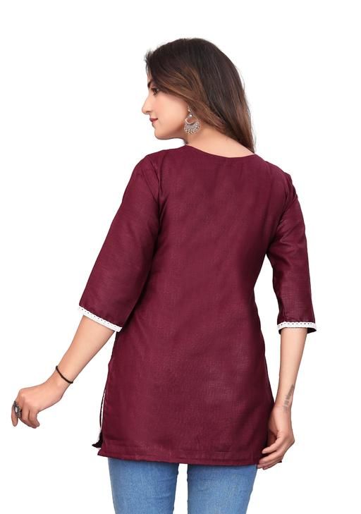 A short kurti for women with embroidery work and full sleeves made from cotton fabric is a stylish and comfortable