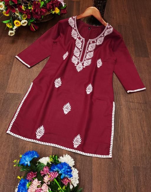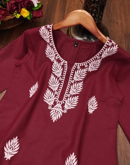 A short kurta for women with embroidery work and full sleeves made from cotton fabric is a stylish and comfortable traditional attire.