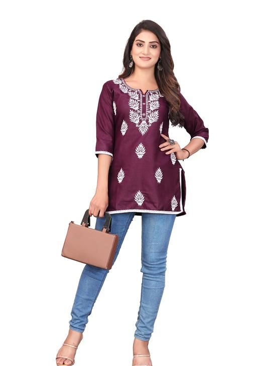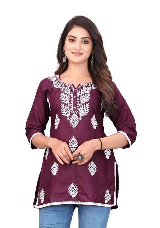 A short kurti for women with embroidery work and full sleeves made from cotton fabric is a stylish and comfortable