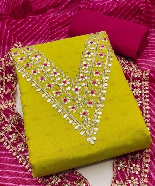 Name: Designer Green Chanderi Cotton Embroidered Suit Set lightweight Chanderi dupatta with fine border work | unstiched women suit