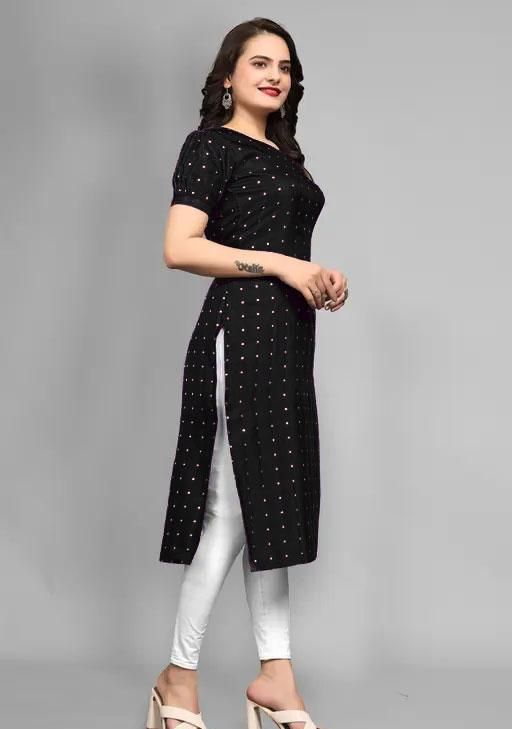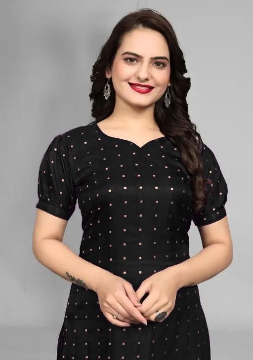 Add a touch of sophistication to your look with our Taffeta Silk kurta, featuring short sleeves and a chic printed pattern. The kurta's luxurious fabric and design make it suitable for special occasions. It comes in sizes S, M, L, XL, XXL, and XXXL, with a bust size ranging from 36 to 46 inches and a length of 42 inches, ensuring a great fit for all. The kurta's sleek silhouette and elegant appeal make it a timeless addition to your wardrobe.