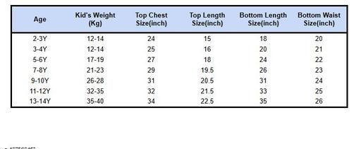 8-9 Years (Top Chest Size: 10 in, Top Length Size: 10 in, Bottom Waist Size: 10 in, Bottom Length Size: 10 in)