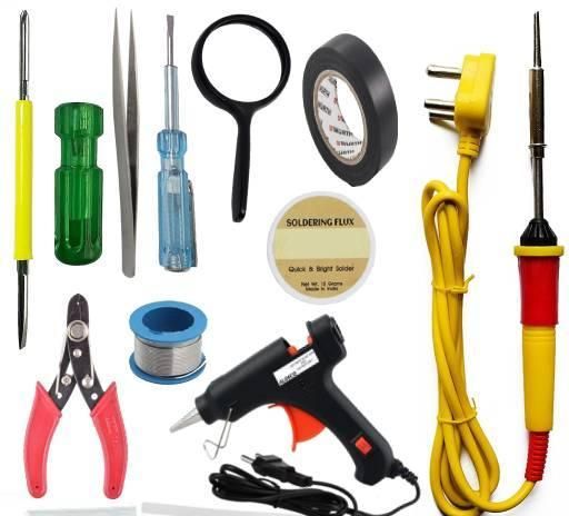(Pack of 11) GLUE GUN KIT WITH SOLDERING IRON OR OTHER ESSENTIAL TOOLS(Wire,Flux, Lense etc.)