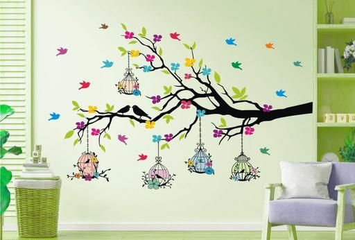 Name: - Extra Large - Wallsticker Tree Branches With Birdcage And Flower- Wall stickers Decoration Sticker ( ideal size on wall: 127 cm x 80 cm ),Multicolour