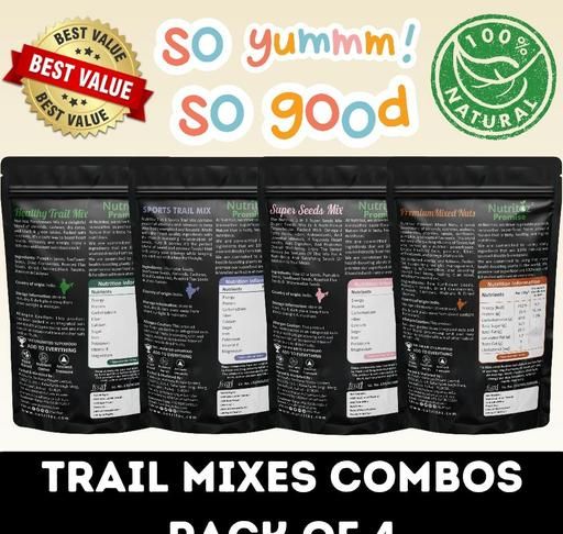 Name: Mixed Dry Fruits, Mixed Nuts, Trail Mixes and Mixed Seeds with Nuts, Seeds & Berries Combo Pack of 4 (50gm EACH) Packed with a Nutrient-Rich Snack Blend with Protein, Fiber, Omega-3 50GM Each Combo Pack (Total 200gm)