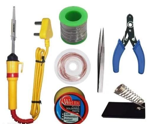 Name: Soldering Iron Kit Pack-7 | Cutter | Stand | Solder Wire | Soldering Paste Flux | Tweezer | Desoldering Wick | Yellow+Half+Red Soldering iron 25 W Simple (Flat Tip)