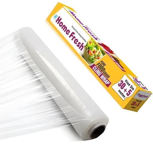 HomeFresh Cling film. Cling film is a versatile wrap for all kitchen and household needs. You can wrap roti, paratha, sandwich, burger, etc. to keep food safe and fresh for a long period of time. KEEPS FOOD FRESH- This cling wrap extends food freshness and keeps in moisture to prevent freezer burn. The weep keeps air out with a tight seal, is BPA free. TEARS OFF EASY- The food wrap built-in slide cutter can be torn away from the dispenser with ease and provides a clean cut for consistent tearing that helps to minimise tangling and waste. MULTIPURPOSE USE- Its designed for kitchen use, it can be used for storing and reheating leftovers, keeping ingredients fresh in the refrigerator or freezing bulk foods. It seals any type of surface from glass to metal and sticks perfectly.