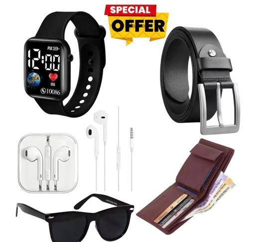 This exclusive offer is perfect for men who want a complete look. The **black belt** is versatile for formal and casual outfits, while the **digital watch** adds a modern touch. The **brown wallet offers plenty of space for your essentials, and the **wired handsfree** ensures clear sound quality. The *sunglasses** bring a trendy vibe to your wardrobe.