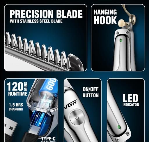 Product Name: "VGR V-071 Professional Hair Trimmer with Precision T-Blade, Turbo Function, 120-Min Runtime, Corded & Cordless Use, Type-C USB Charging, Red/Green Indicator Lights, 3 Guide Combs (Silver)