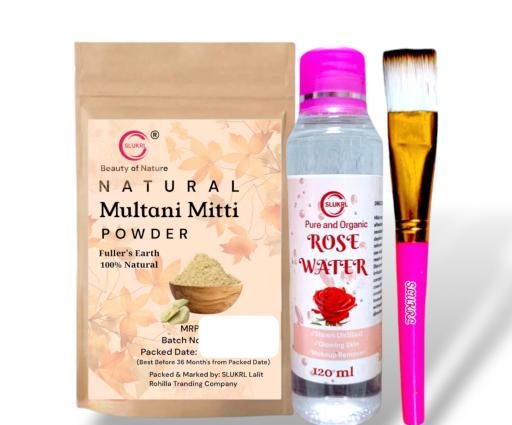 Product Name: Pure and Natural Face Pack powder multani mitti powder Rose Water Gulab Jal and Single Stick Brush Pack of 3 for face and Hair