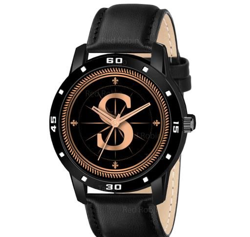 Name: Analog Round Black Dial ALPHABET S Design Stylish Black Leather Strap Classic Design Fancy Wrist Watch for Men and Boys, Pack of 1 - ALPHA-S-AVO-BLK-L