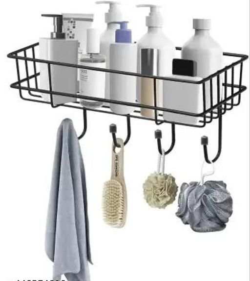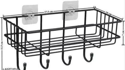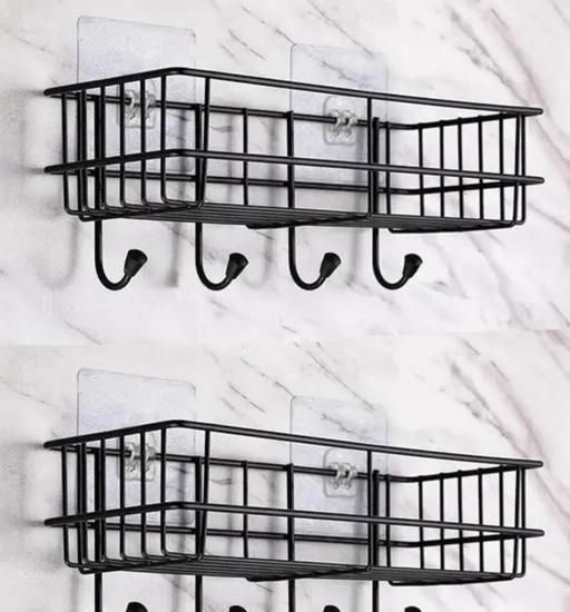 Name: (PACK OF 2) Steel Self-Adhesive Multipurpose Bathroom Shelf with Hooks/Towel Holder/Rack/Bathroom Accessories-Wall Mount - Pack of 2 (Black,Powder Coated)