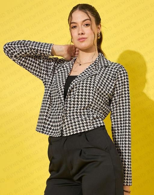 Name: Buynewtrend Cotton Blend Black and White Houndstooth Print Short Blazer Shrug
