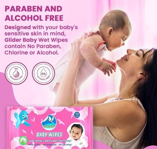 WE LOVE BABIES ... And we understand how important is it to keep baby's skin clean , while staying soft and healthy GLIDER Baby Wet Wipes , are among the finest aromatherapeutic wipe for your baby GLIDER Baby Wet Wipes feature a mild and non-irritating formula that is as gentle as water on your baby's skin.Size of each Wipe - 14 x 20 cm . Country of Origin - India