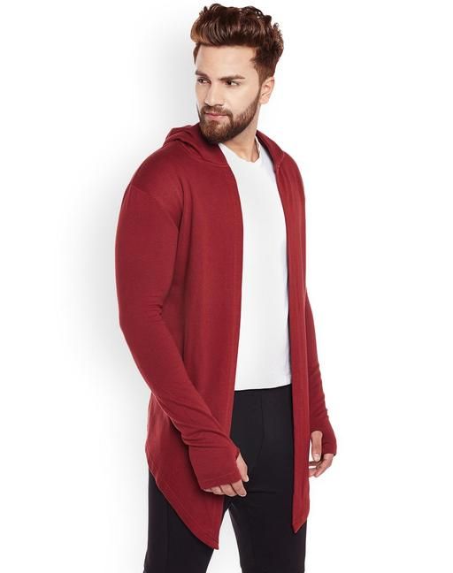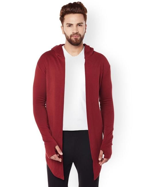 Name: Men Mehroon Hooded Thumbhole Open Long Cardigan Overcoat Shrug Men's Party Wear Solid Cotton Square Neck Collar Full Sleeves Cardigan Overcoat/Shrug