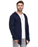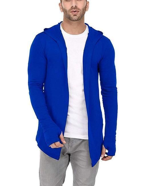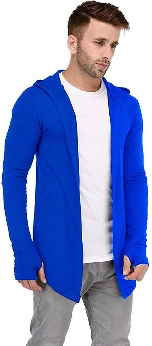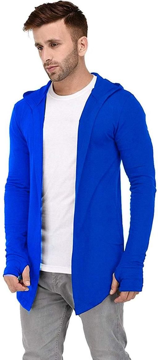 Name: Men Royal Blue Hooded Thumbhole Open Long Cardigan Overcoat Shrug Men's Party Wear Solid Cotton Square Neck Collar Full Sleeves Shrug