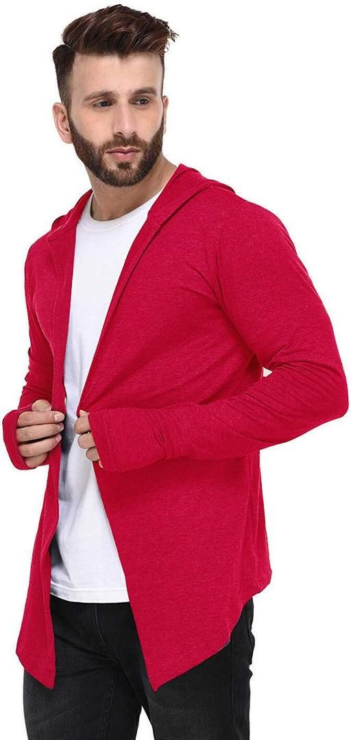 Name: Men Red Hooded Thumbhole Open Long Cardigan Overcoat Shrug Men's Party Wear Solid Cotton Square Neck Collar Full Sleeves Shrug