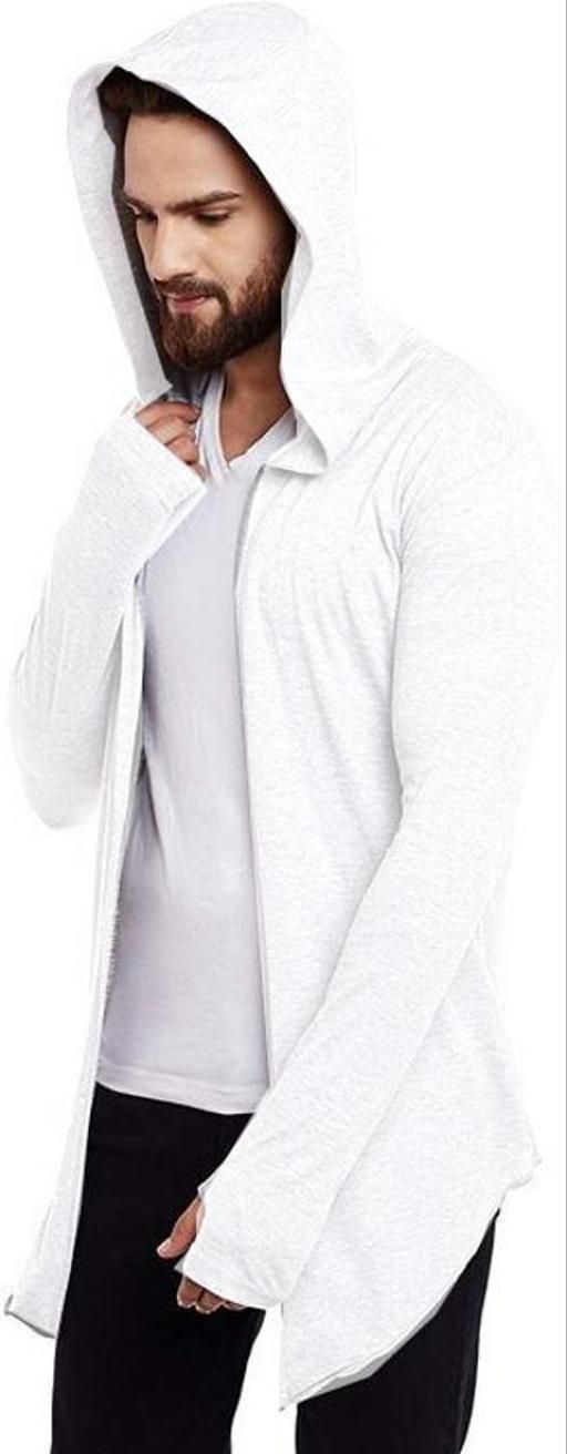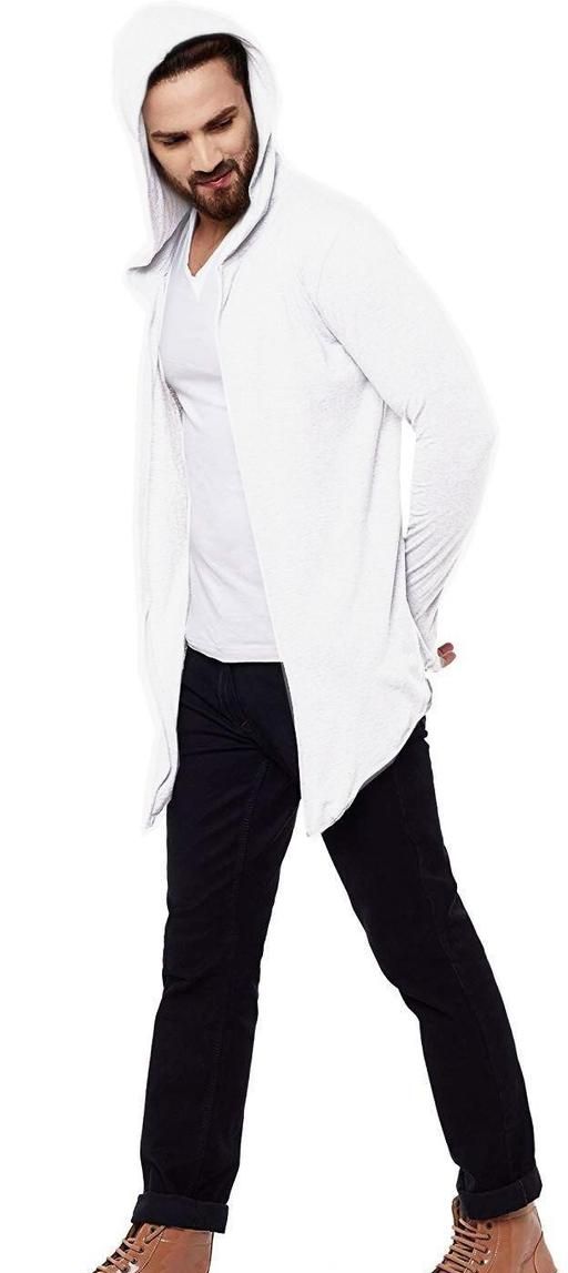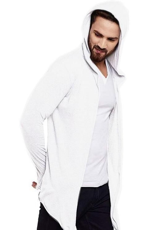 Name: Men White Hooded Thumbhole Open Long Shrug Men's Premium Solid Cotton Square Neck Collar Full Sleeves Cardigan Overcoat Shrug